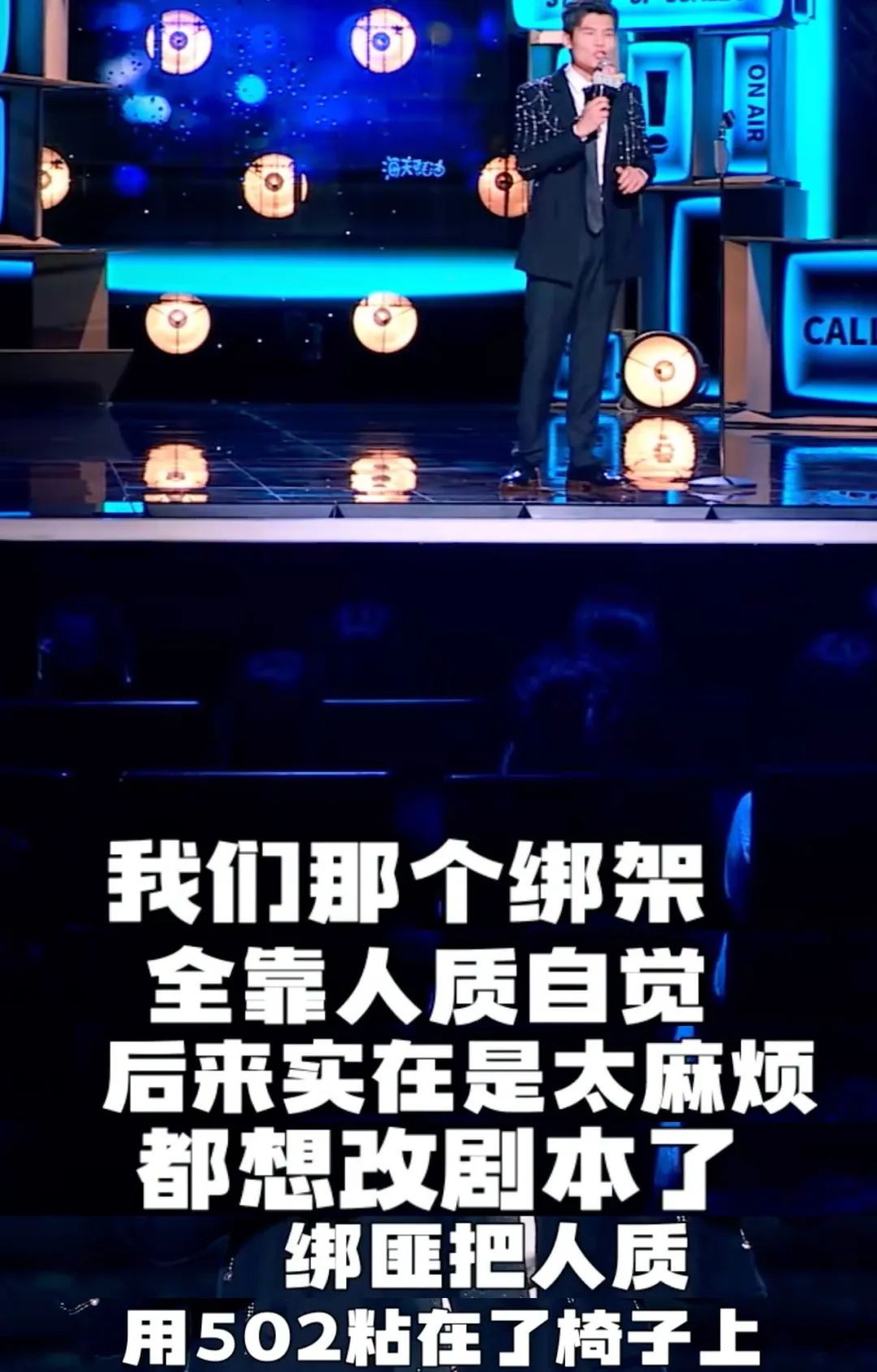这个段子里,要结合上半场他们拍摄短片的过程才会产生共鸣。比如志胜被绑架,广智说他们不会系那个绳子,导致志胜动作不能太大,否则就把自己给释放了。