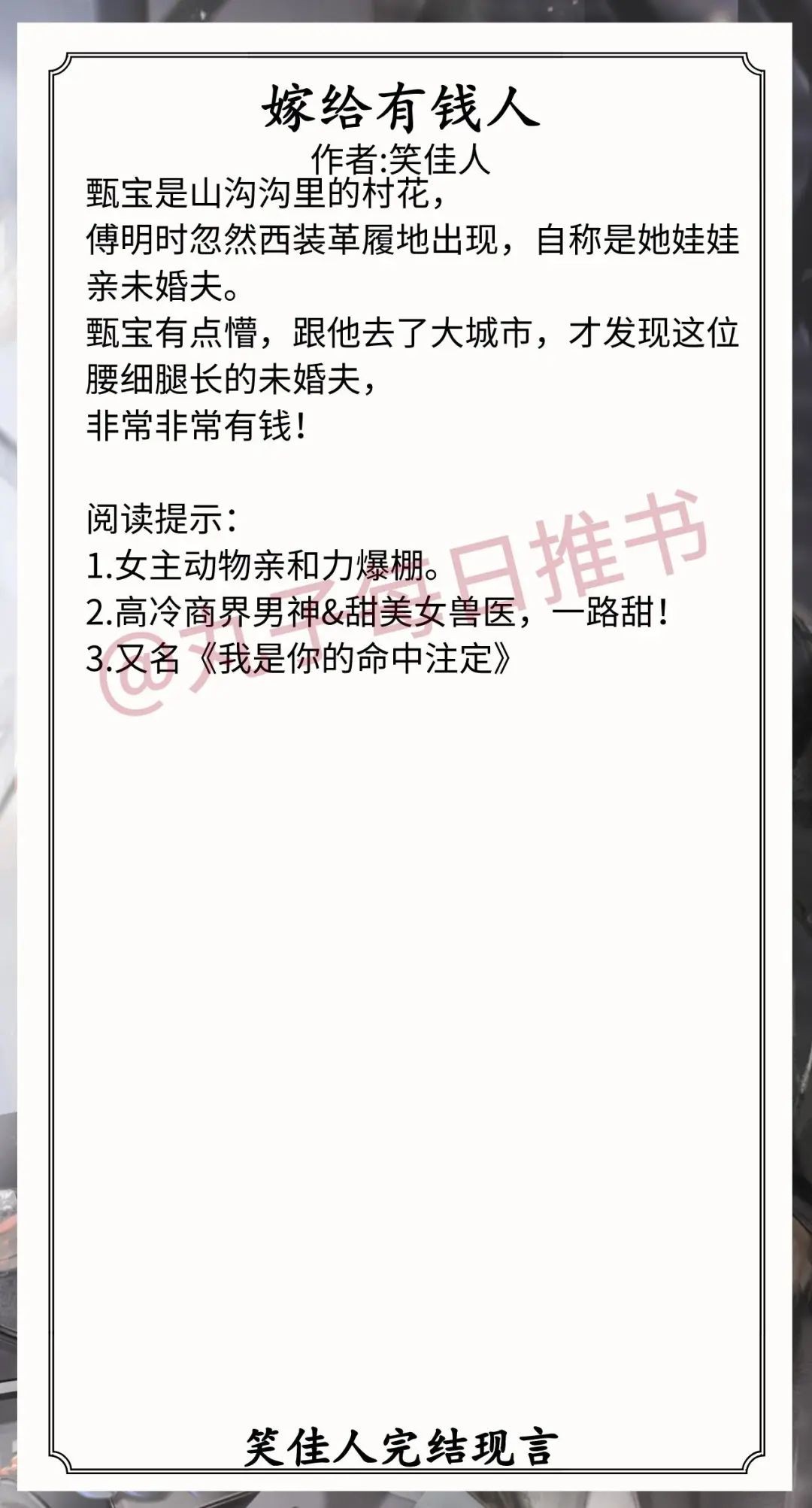 9.《嫁给有钱人》作者:笑佳人(甜美女兽医vs高冷商界男神,恋爱合约,假戏真做,打脸真香,都市童话故事,年龄差8岁)