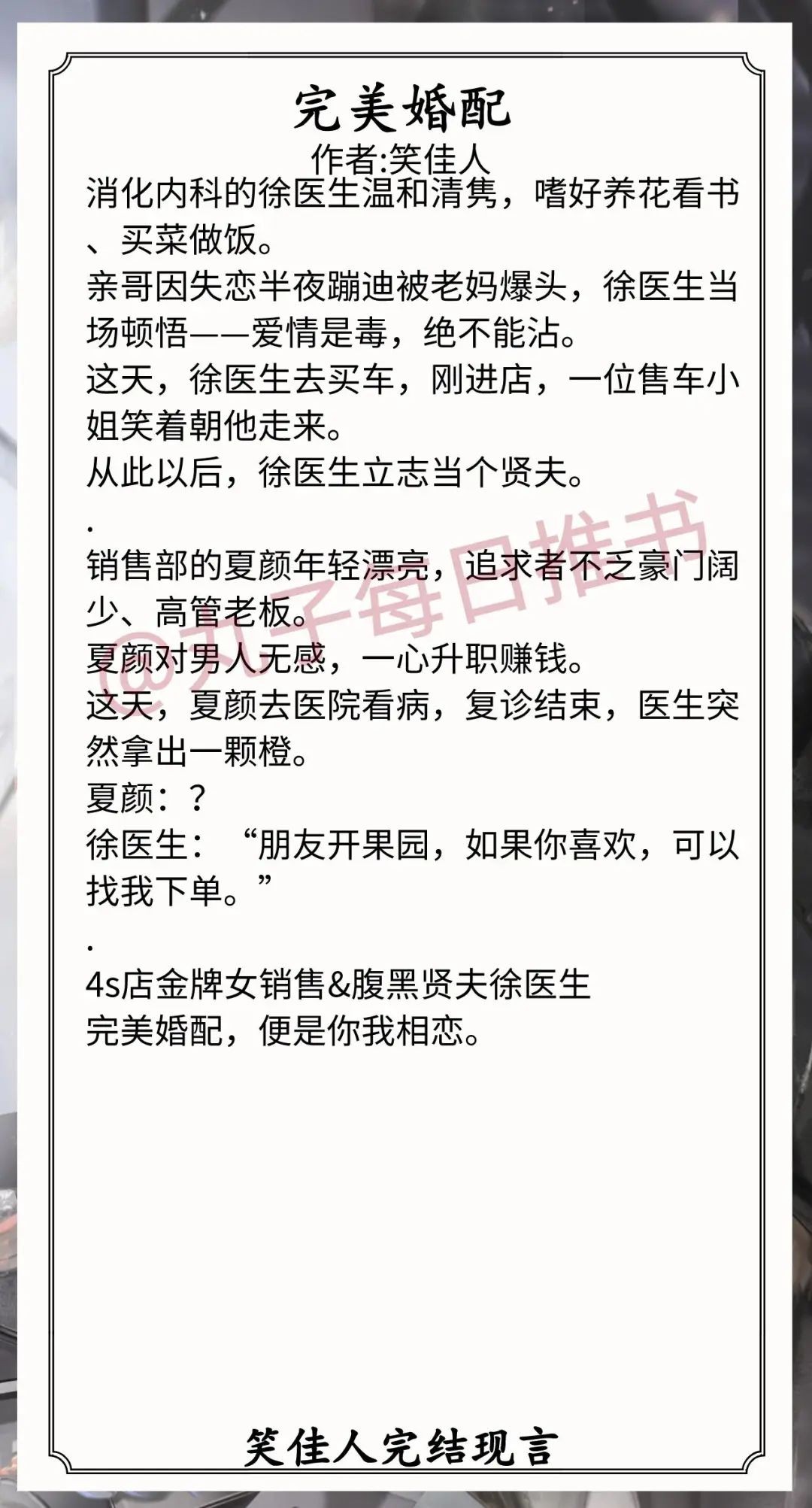 2.《完美婚配》作者:笑佳人(娇俏美丽女销售vs腹黑温柔男医生,一见钟情,都市甜宠文,轻松欢脱风)