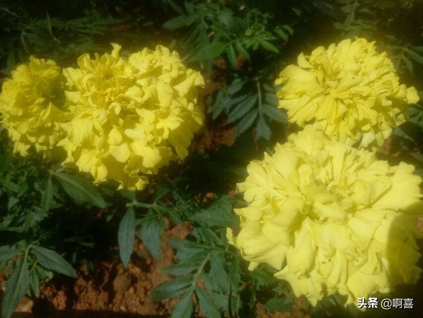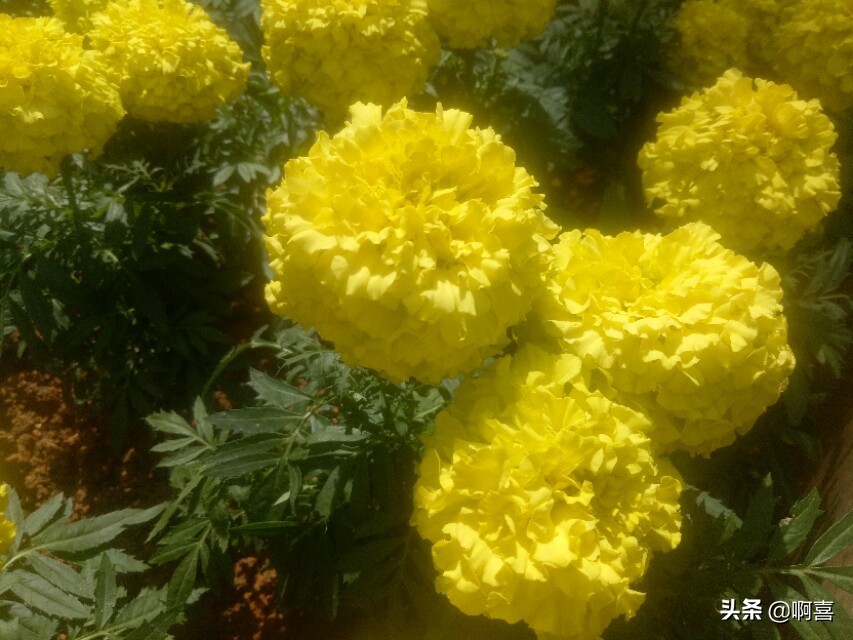 万寿菊开花的时候,金黄色的花朵映衬绿色的叶子,十分和谐有诗意