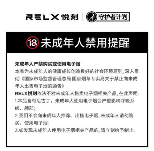 例如,“RELX悦刻”官网首页顶部和底部用黑底白字强烈衬托出警示“守护者计划”以贯彻国家通告要求,其主要内容为:“反对未成年人使用电子烟”“反对在未成年人面前使用电子烟”;“YOOZ柚子”京东旗舰店中商品详情涵盖“YOOZ态度计划:严禁未成年人购买使用;非烟民请注意:尼古丁具有成瘾性,不建议购买使用”的警示。