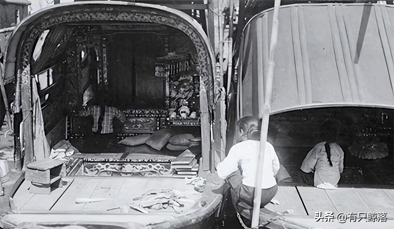 晚清老照片,船妓在整理床铺,裹小脚女子坐男子腿上拍照