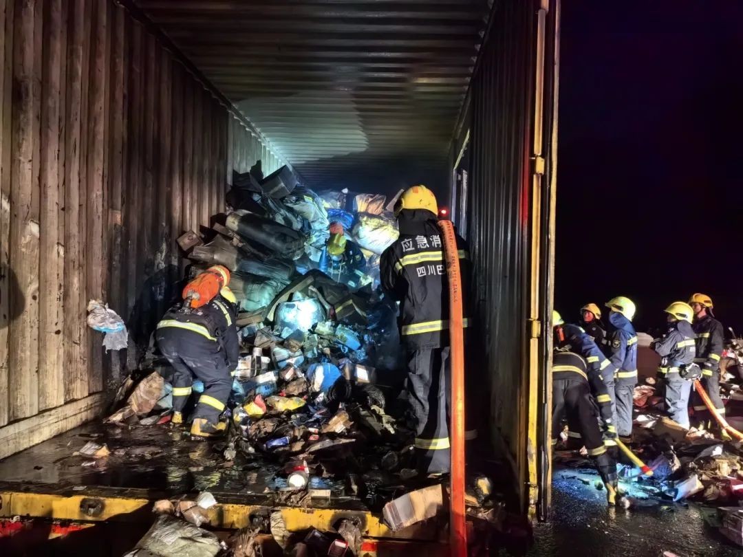 2024年3月,四川巴中,通江县芝包高速服务区附近一辆满载快递的挂车突然起火。消防救援人员到场将火势扑灭,为防止火势复燃,消防员继续对车箱内进行降温处理。