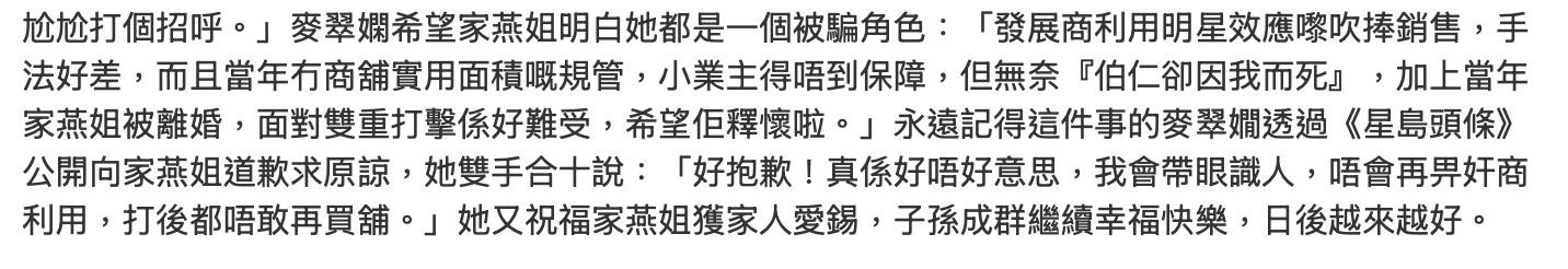 时隔33年麦翠娴重提这件旧事,她称这是人生的一件憾事,自己也是被发展商利用的受害者,在损失了金钱的同时,还牵连了朋友,损失了友谊。麦翠娴表示自己也是一个被骗的角色,当时发展商利用她明星的效应吹捧销售,加上当年的商铺管理法制尚未完善,小业主得不到保障,结果连累了无辜。麦翠娴在受访中郑重地向学急眼道歉求原谅,还双手合十,她称“很抱歉,真是不好意思,我会带眼识人,不会再给奸商利用,往后都不敢再买商铺。”,总之她目的就是希望薛家燕能够释怀。