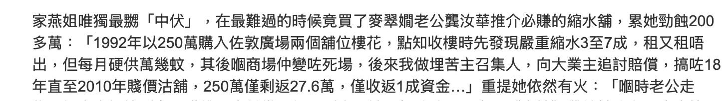 回头来说薛家燕当年成为受害者这件事。薛家燕在1992年以250万买入了佐敦广场两个铺位,当时就是受到麦翠娴夫妇的极力推荐而买入,结果在收楼的时候发现实际的铺面面积与宣传的不符合,结果铺面租又租不掉,每个月还要供几万元的房贷,之后这个商场更是变成了死水,根本就没有人流。无奈之下,薛家燕成为了苦主召集人,向大业主追讨赔偿,前前后后搞了18年,直到2010年才贱卖商铺,250万买入的商铺最后就只剩下27.6万,也就是说回笼的资金仅仅有一成。