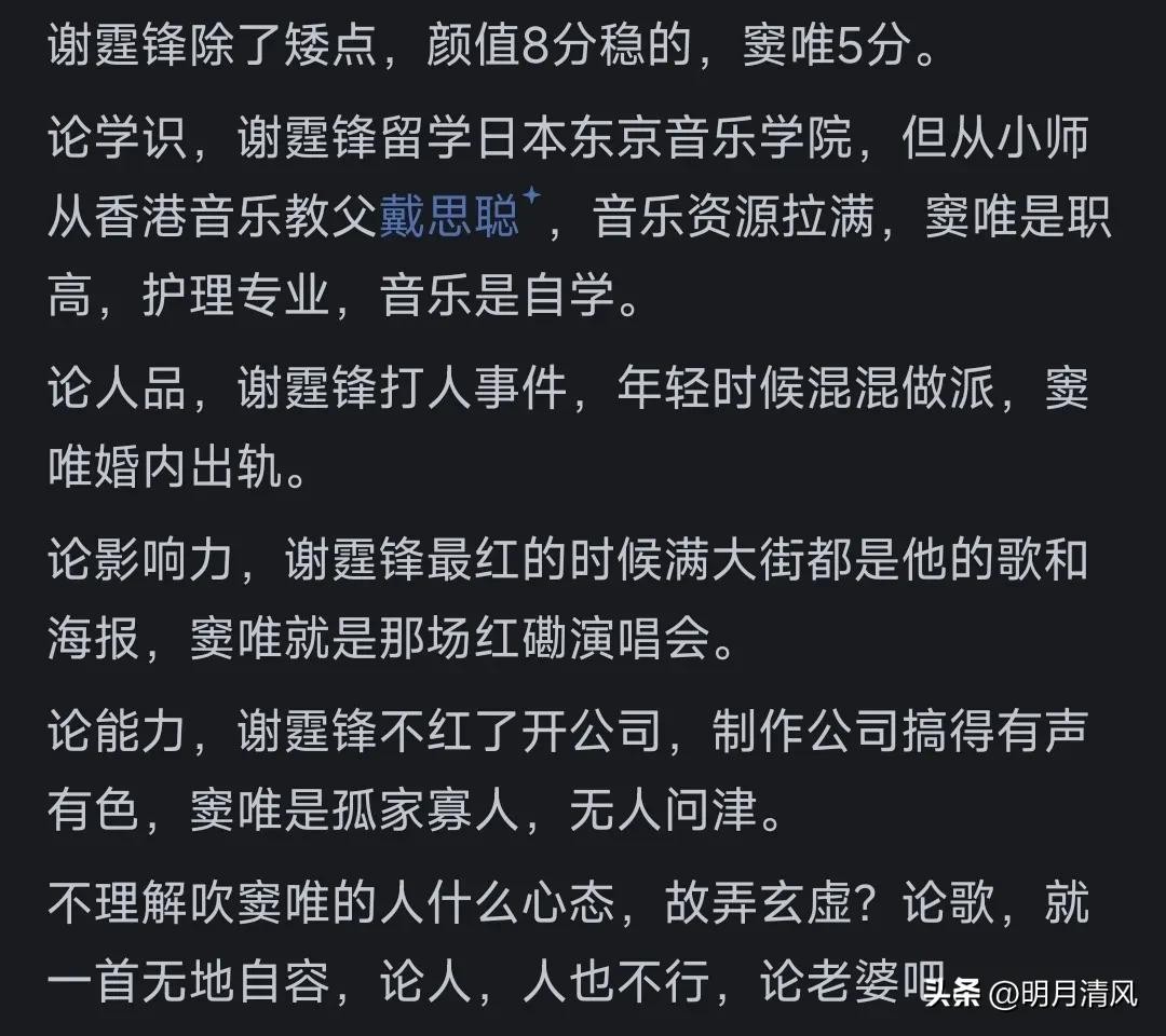 谢霆锋比港圈大部分明星都优秀的多,自律,谦逊,敬业。拍动作片,很多打戏都不要替身,自己抗。喜欢他当然也是没问题的。他和窦唯纯粹不是一路人,放到一起比也没啥必要其实。