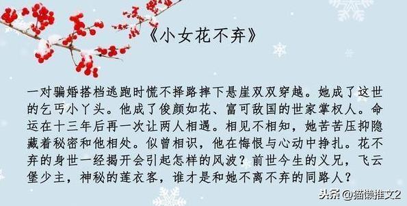 《小女花不弃》作者:桩桩简评:上辈子花不弃和男主是一对搭档着骗婚骗钱的小伙伴,在一次被人追杀的逃亡路上两人慌不择路的掉入悬崖,却意外穿越。花不弃成了一个小乞丐,而男主却成了世家大族的掌权人,曾经相依为命的人如今和自己云泥之隔,十三年后,两人相遇,花不弃怀揣着一个巨大的秘密……