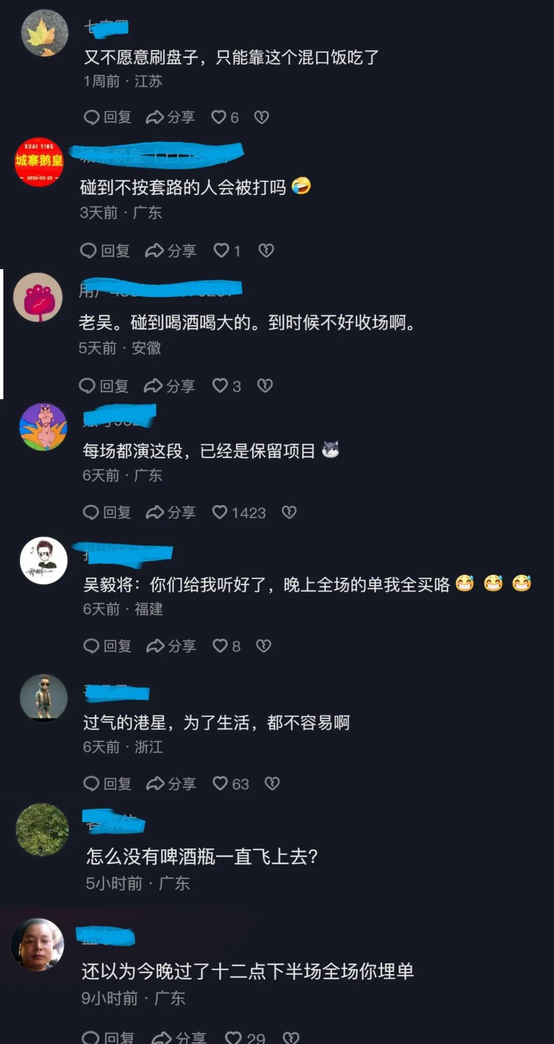 在酒吧的舞台上,吴毅将还会指着围观的观众,对他们“口出狂言”,大家明白这是表演,所以比较配合表演出对骂的感觉,并不生气。