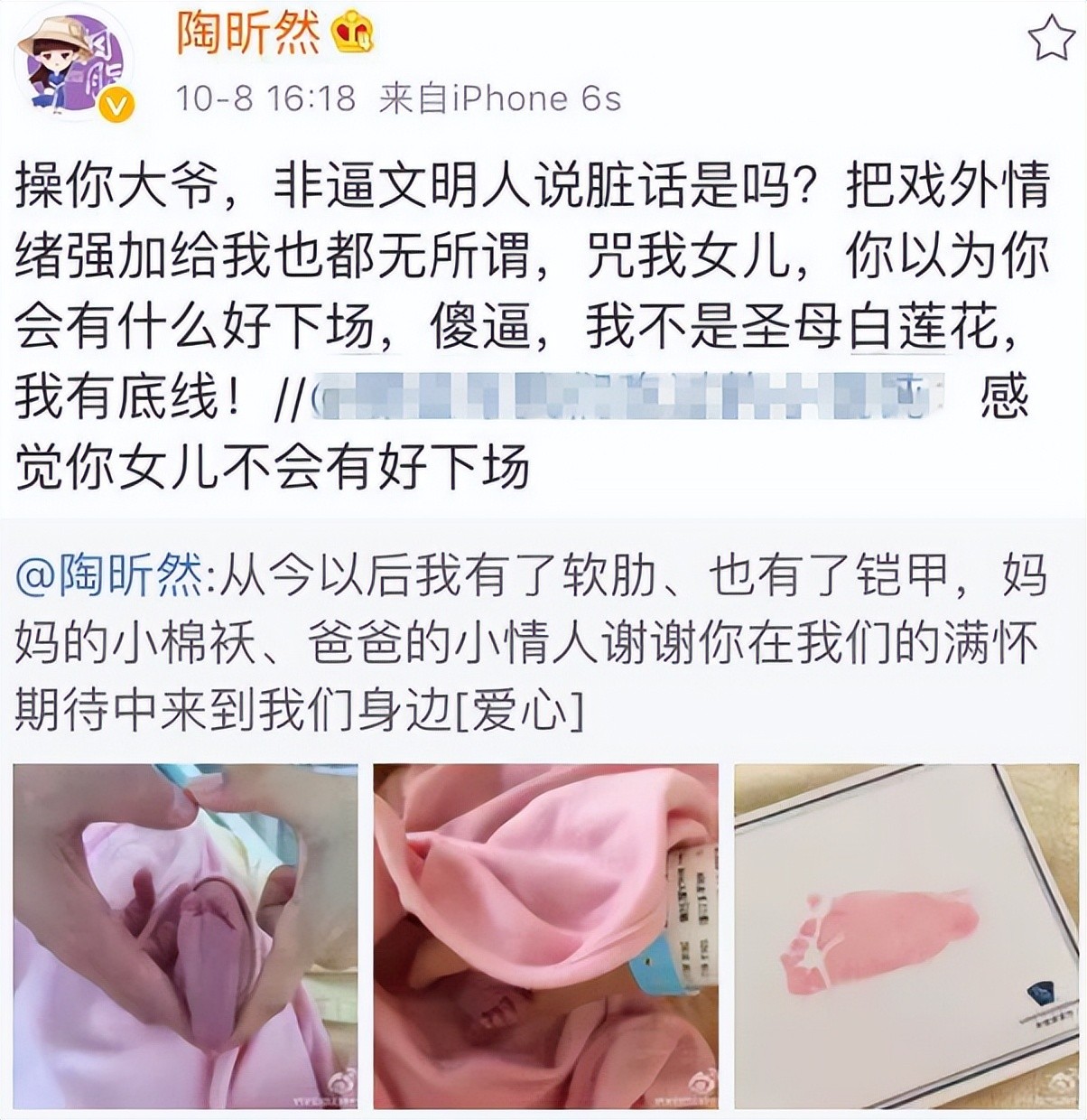 记得当初有网友就发文咒骂陶昕然刚出生没多久的女儿,这让身为妈妈的陶昕然无法再忍受,公开发文与攻击女儿的网友对骂。