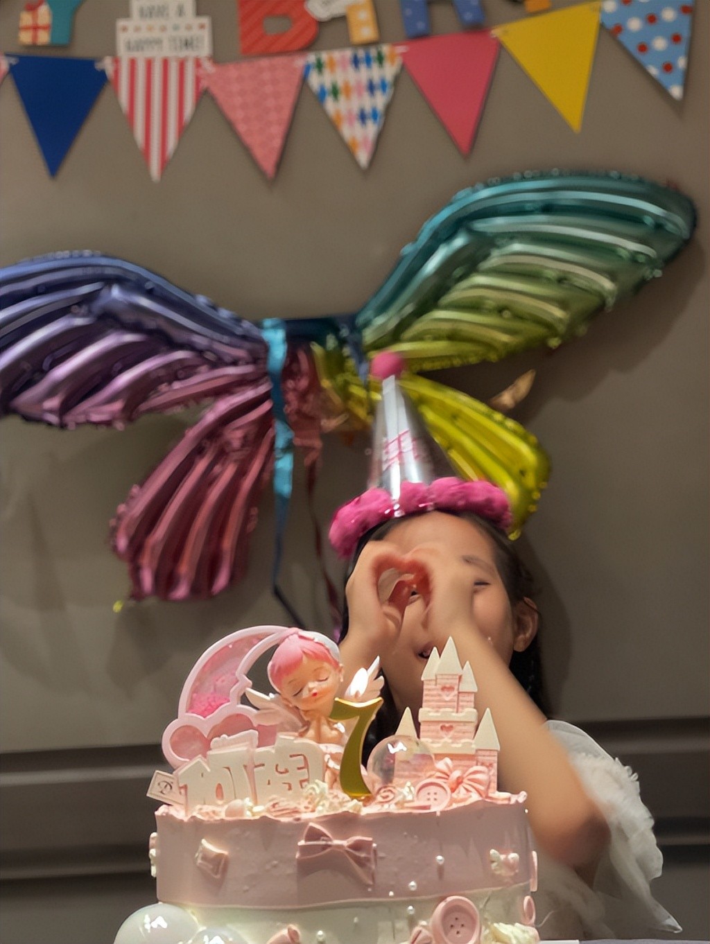 对于迎来生日的女儿,陶昕然和老公何建泽亲自为女儿布置了温馨的生日现场,墙壁上粘好了生日字母挂件,还有小女孩们都喜欢的天使翅膀气球,十分用心。