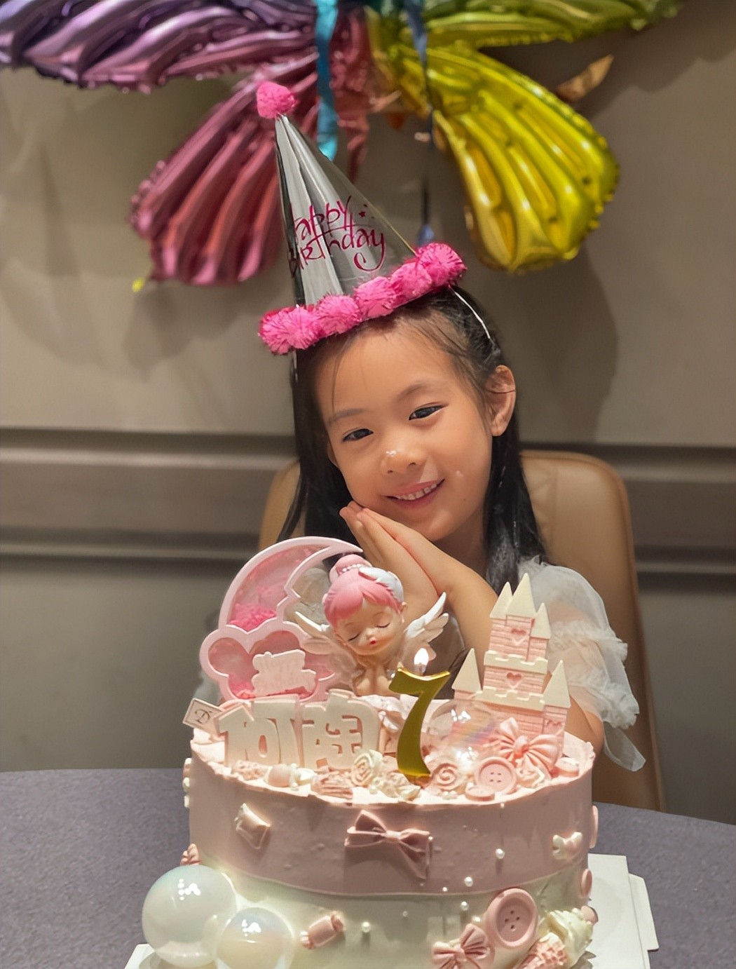 再看小何陶,身为寿星的她头戴生日帽,身前桌子上摆放着粉色城堡生日蛋糕,对于父母为自己准备的生日惊喜,小何陶十分喜欢,面露甜笑对镜比心。