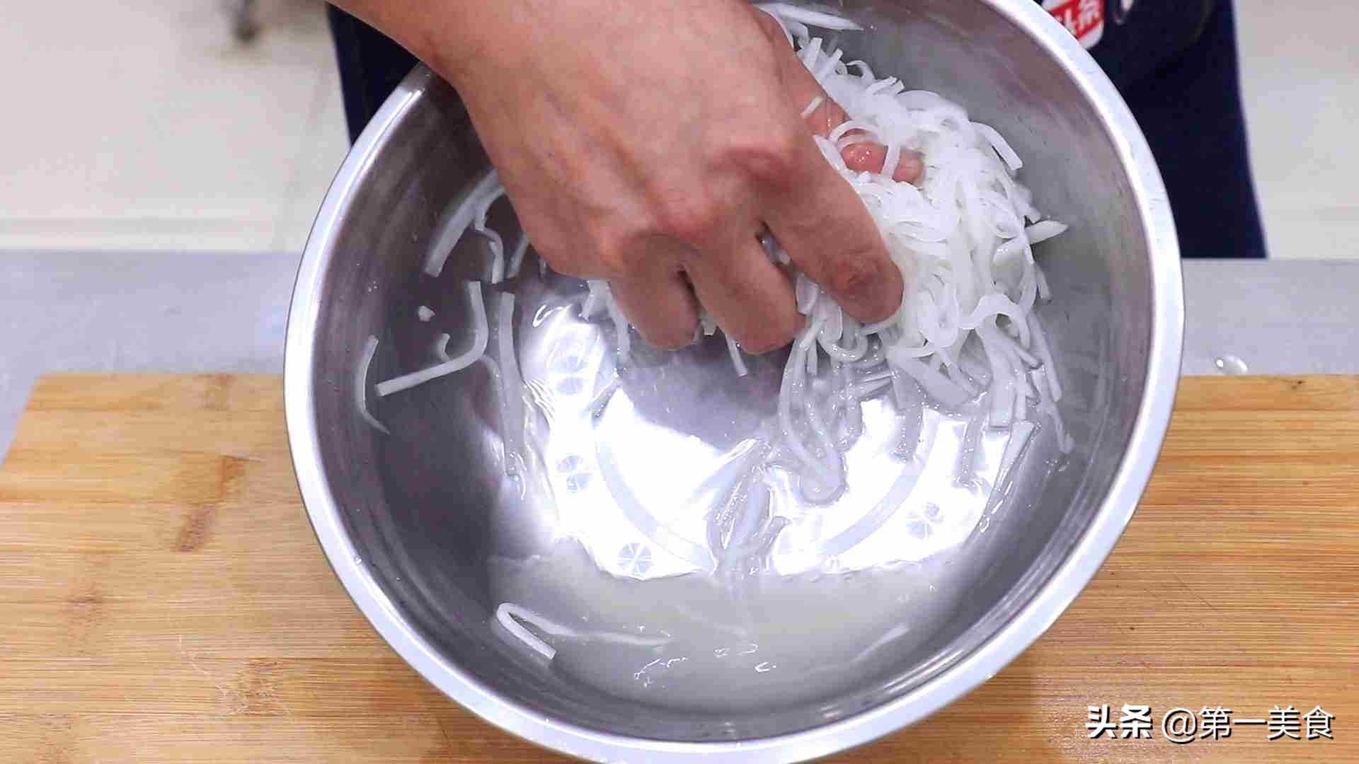 3.10分钟以后萝卜丝已经析出了很多水分,我们把它用清水多淘洗几遍,洗去多余的盐分,然后挤干水分放入盆中。