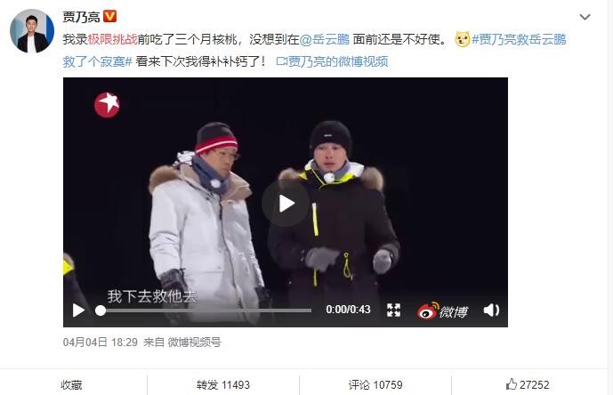 4月4日晚,贾乃亮在社交平台晒《极限挑战》视频片段,称自己救岳云鹏救了个寂寞,他写道:“我录极限挑战前吃了三个月核桃,没想到在岳云鹏面前还是不好使。看来下次我得补补钙了!”视频中,贾乃亮救岳云鹏不成,自己率先滑下了坡,一旁等待救援的岳云鹏作难以置信状,画面看起来像是来搞笑的。
