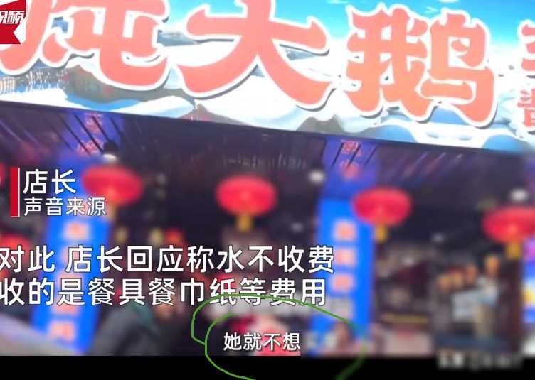 面对女士的抱怨,餐馆老板表示,餐费是合理合规的,每份炖大鹅的价格都是明码标价的,并且足够8个人食用。他还解释说,茶水费并不只是单纯的水费,而是包含了餐具、餐巾纸等服务的费用,这是餐馆常规做法,并非“宰客”。