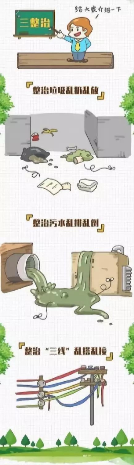 截止目前,全镇累计完成清理巷道、建筑材料乱堆乱及放房前屋后和村巷道杂草杂物、积存垃圾共2440处、3665吨;清理沟渠、池塘、河道淤泥、漂浮物和障碍物541处约326.2吨;拆除危房、废弃猪牛栏、露天厕所、乱搭乱建、违章建筑及非法违规商业广告、招牌等共1312处约28640平方米;完成生活垃圾、生活污水、水体污染整治42宗,“三线”乱搭乱接整治约960米。