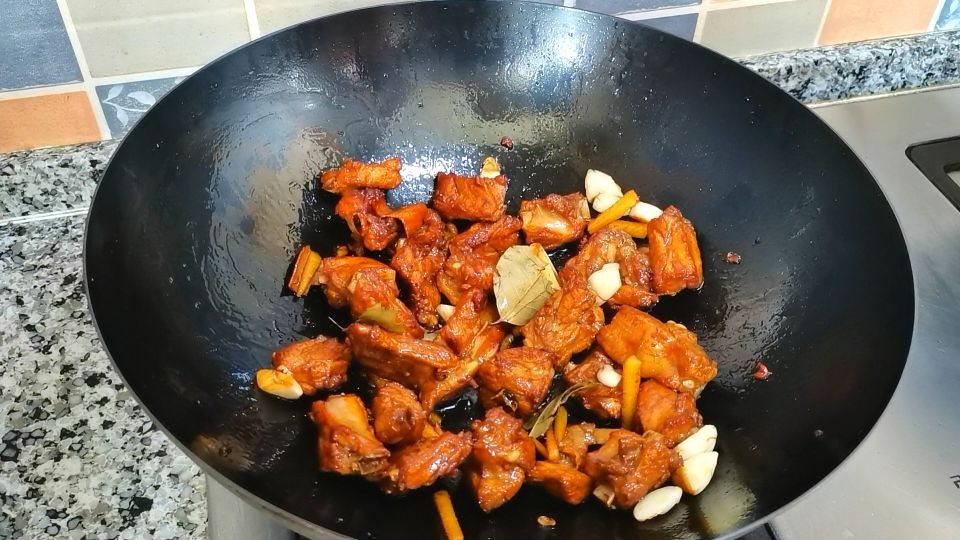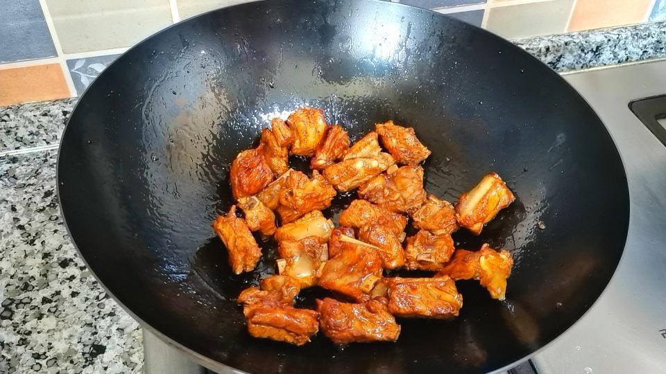 5,下入排骨,翻炒上色。