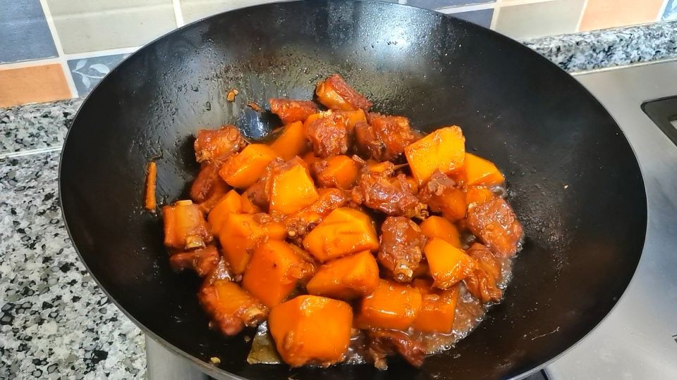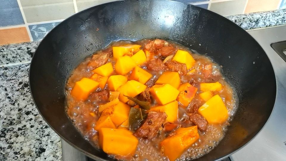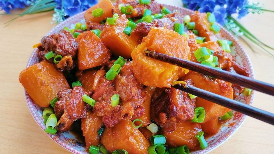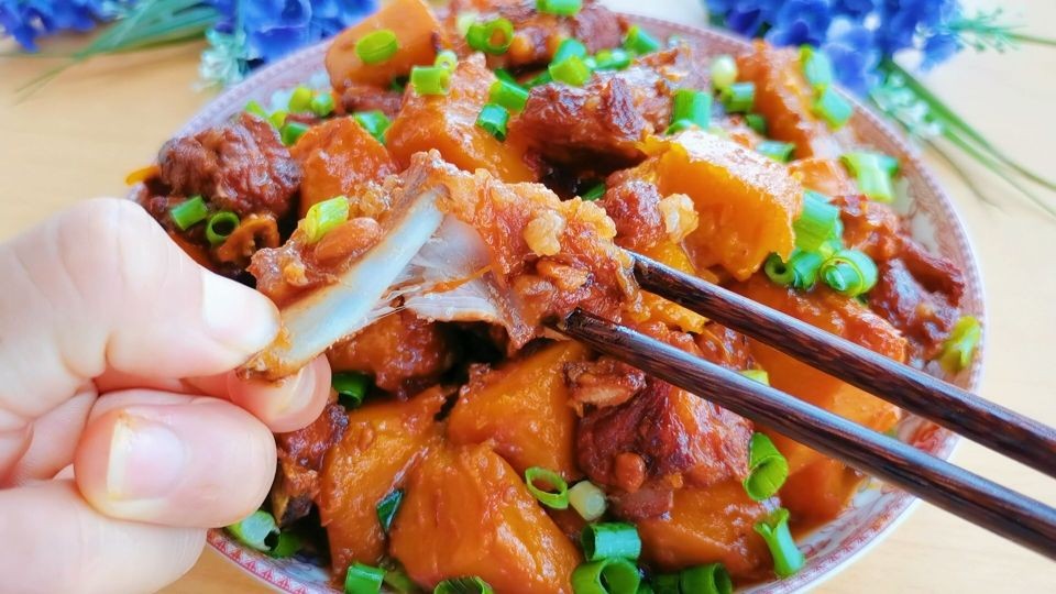 南瓜烧排骨,粉糯、脱骨,一番田园风味,做法简单,老少皆宜