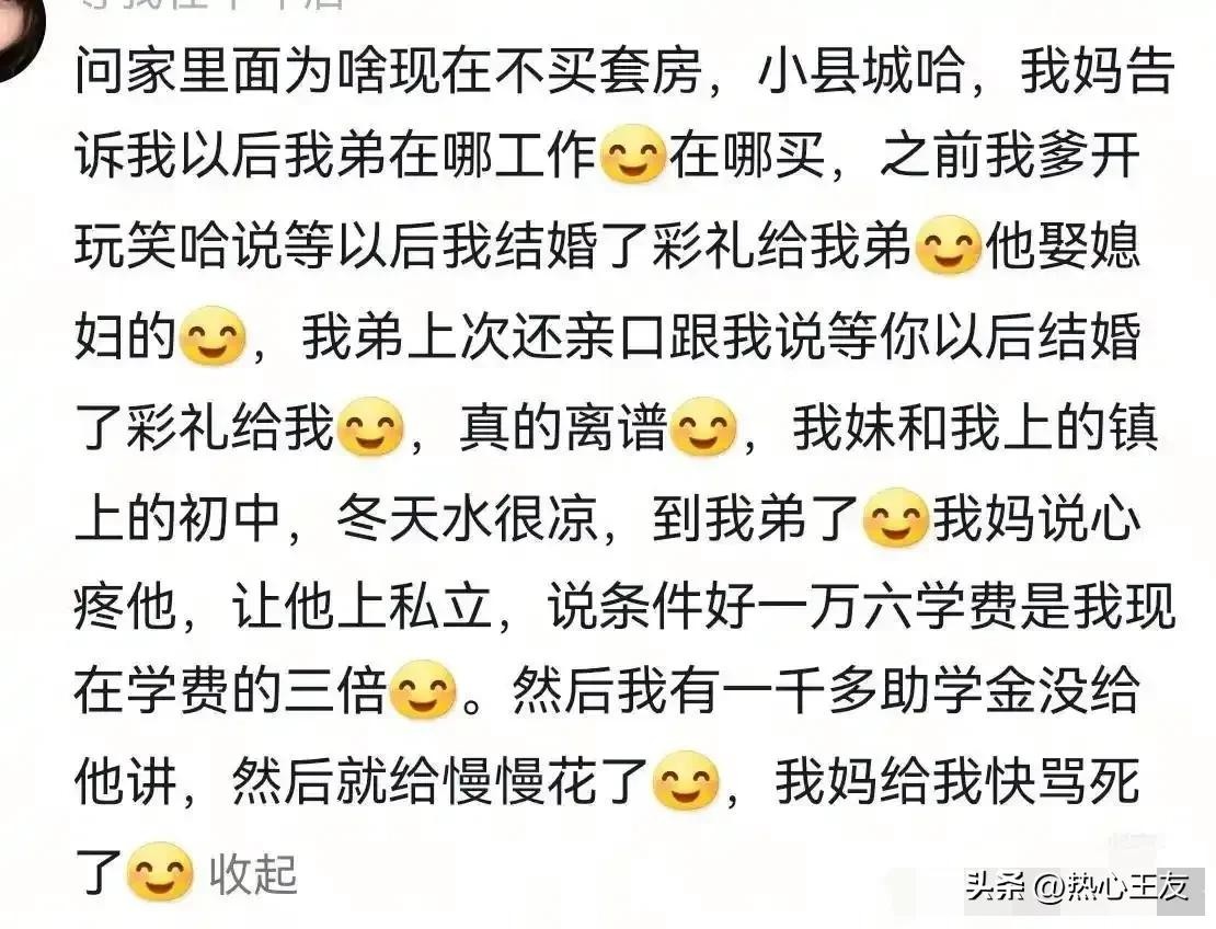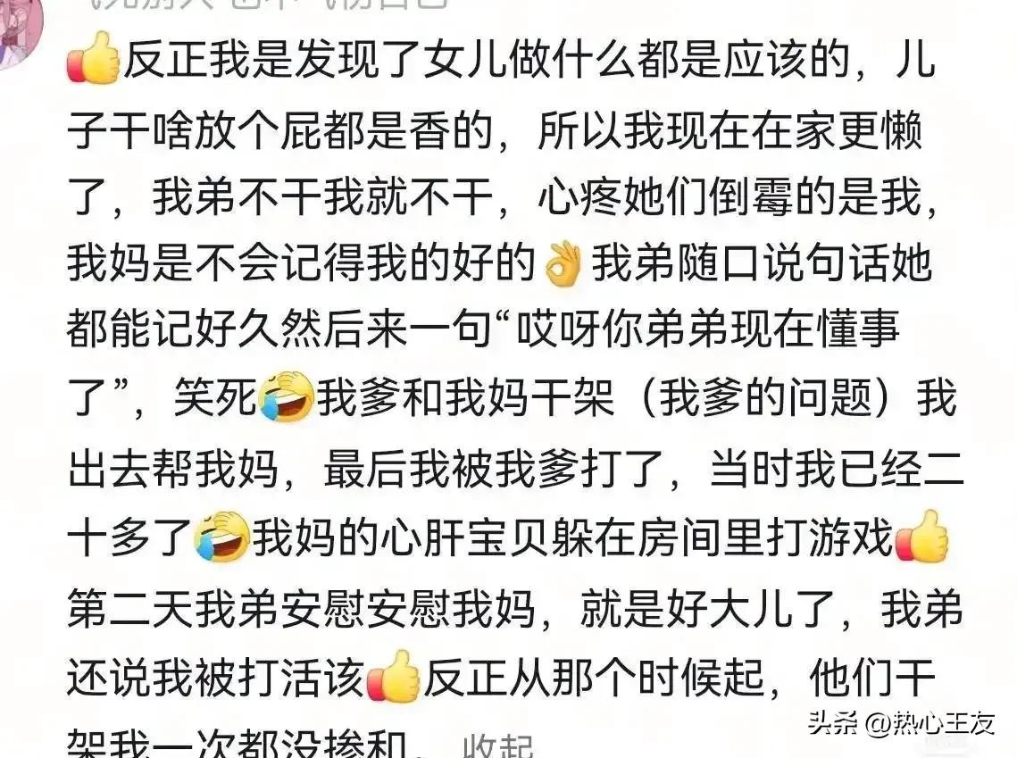 很多农村男孩,因为过度依赖父母,成年后仍然“啃老”,没有能力独立生活,最终让自己陷入困境。所以说,那些偏爱男孩、忽视女孩的父母,现在真的该反思了。