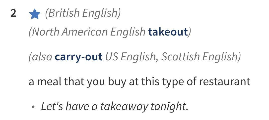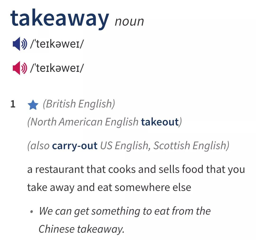 ↑↑根据takeaway注释的第1条,takeaway是英式英语,北美英语用takeout,美国和苏格兰则用carry-out (或 carryout),都是指: