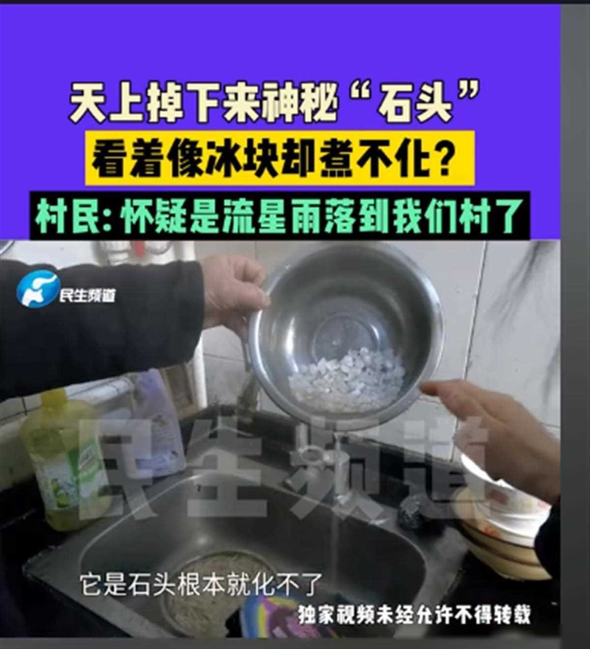 在河南新乡市获嘉县照镜镇西仓村,村民们发现了一个令人惊奇的现象。天空中不断掉下一些奇特的“石头”,这些石头晶莹剔透,看似冰块,但令人惊讶的是它们在开水中煮不化。这一神秘现象引起了广泛关注和好奇心,人们纷纷猜测这些“石头”的来历。