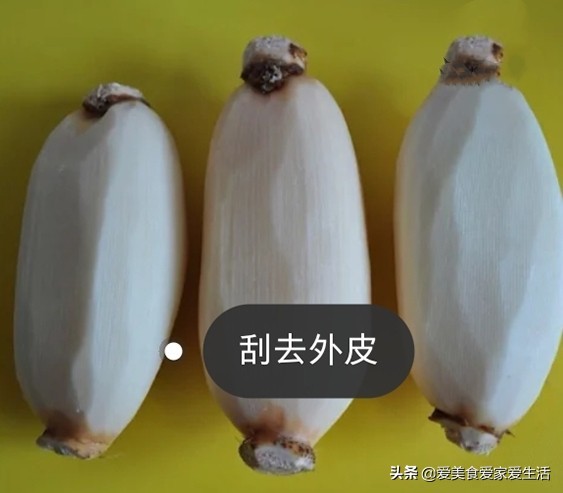 2、清洗干净的藕用刮刀刮去外皮。尽量将外皮刮到蒂头处。
