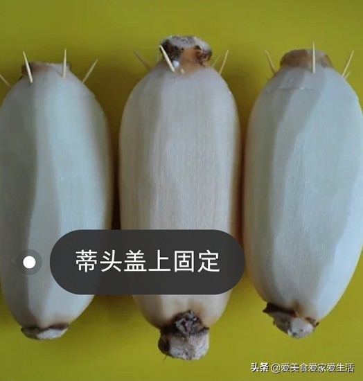 6、填好米的藕重新盖好蒂头,用牙签固定严实(蒂头的藕孔也填好糯米)。