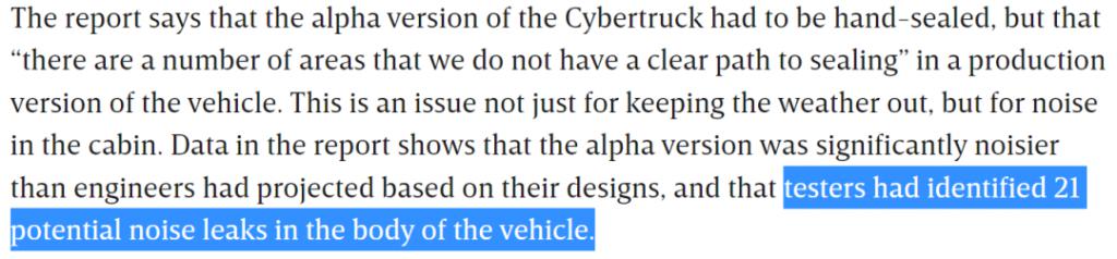 报告里是这么说的,由于 Cybertruck 的车外采用了很多厚的一比的不锈钢材料,不仅加工难度大,按特斯拉的传统,想把外壳各部分之间的缝隙做齐,更是难上加难。