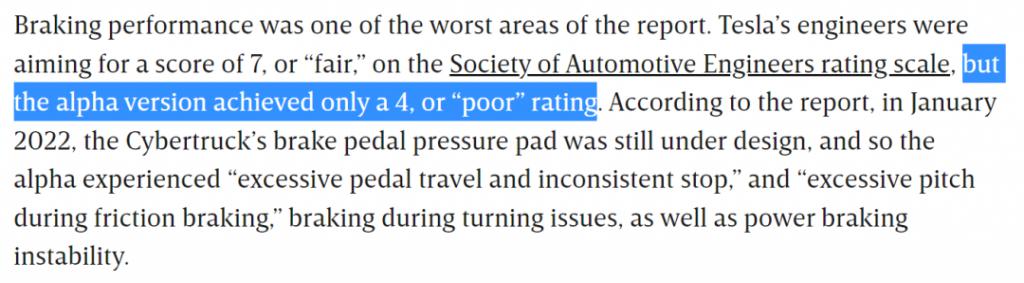 而本来特斯拉的工程师们的目标,是让 Cybertruck 在美国汽车工程师协会( SAE )那满分 10 分的刹车测试里,拿个 7 分(一般)就凑合的。可最后实测的结果,却只有4 分( 差 )。