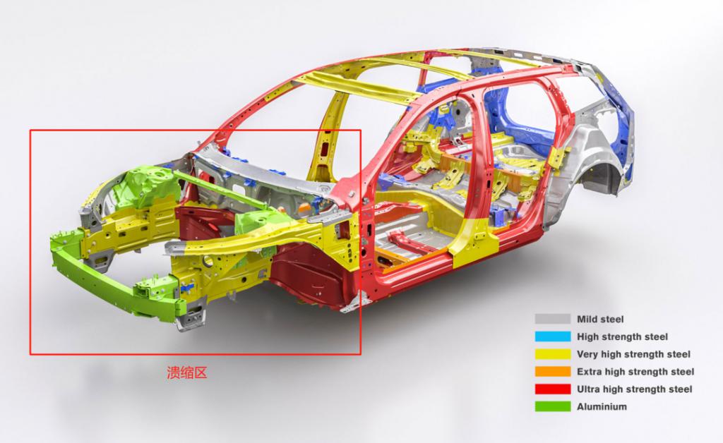 所以,成熟的笼式车身设计,都会在乘员舱前方设计大面积的溃缩区用于吸收碰撞的冲击,再用 A 柱等结构把冲击力分流保证安全。