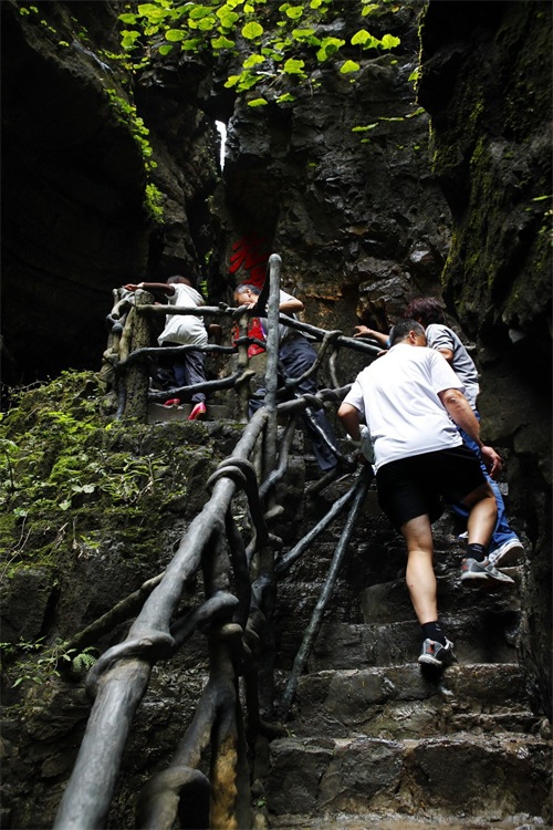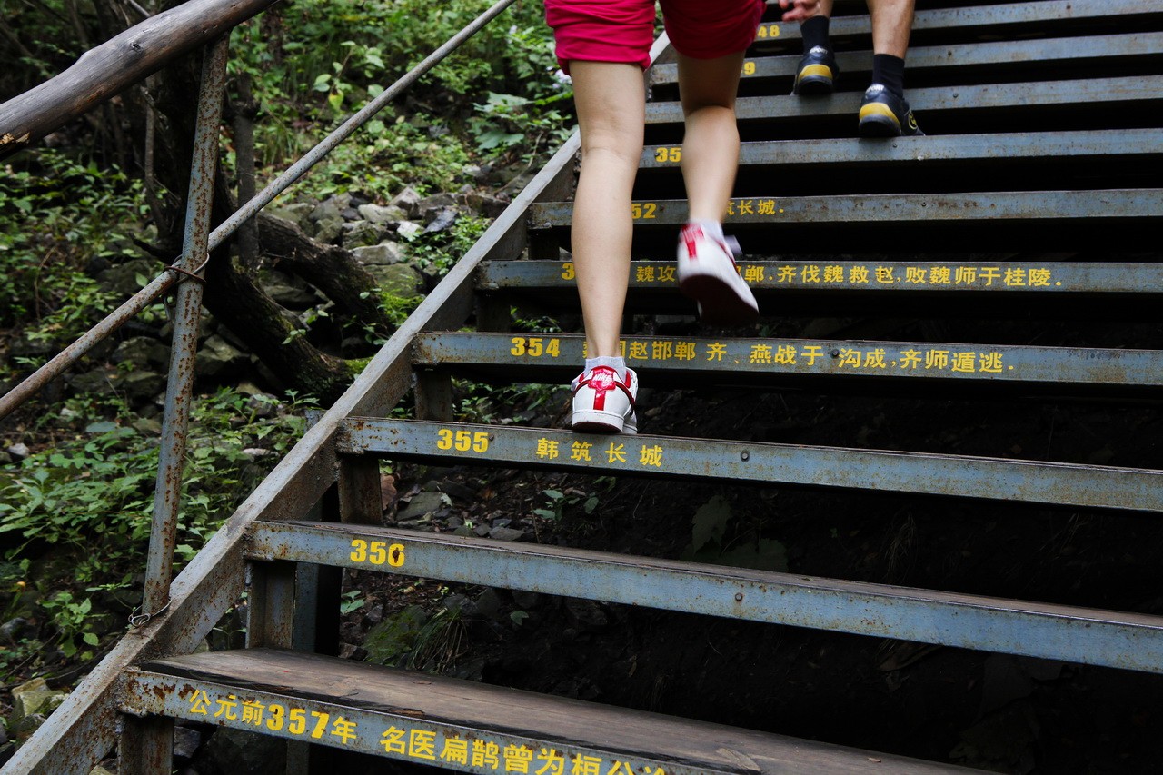 百里峡天梯将海棠峪峡谷与十悬崖峡谷连起来,共2800阶,每级对应一个年份,在台阶上标出那一年的历史重大事件或重要文献,使游客在攀登天梯挑战自身体能的同时,既欣赏了俊美风光,又感受了中华悠久文明。