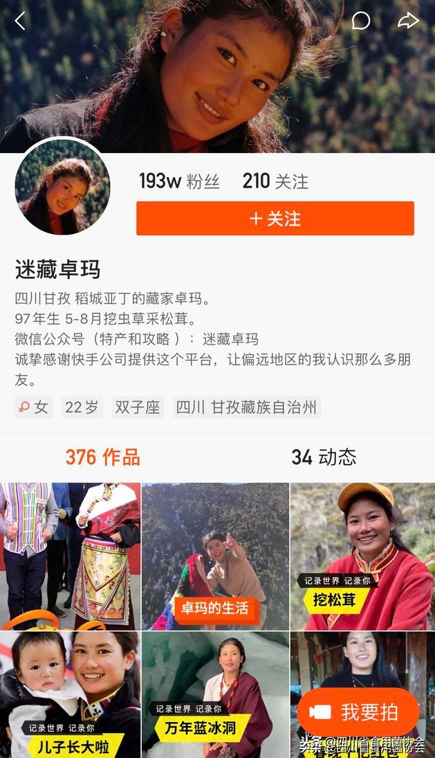 近日,美国时代周刊专题报道了为家乡松茸代言并带货的快手用户格绒卓姆(快手昵称:迷藏卓玛)。这是继“手工耿”、“陈力宝唢呐”、“陈燕和她的导盲犬”等之后又一个被国际主流媒体深入报道的普通快手用户。