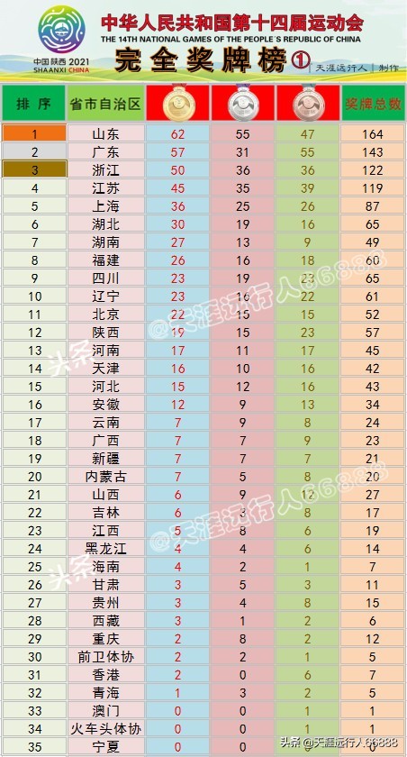 十四运赛事尘埃落定,今晚举行盛大的闭幕式,全运会会旗将交给粤港澳大湾区全运会组委会,西安全运会圣火熄灭,让我们共同期待2025,共同期盼魅力四射的广州、香港、澳门。根据【中华人民共和国第十四届运动会信息发布系统】所发布信息,整理的陕西西安第十四届全国运动会竞技体育赛事的奖牌榜,发到文中,让我们细细回味十四运的时时刻刻、点点滴滴,把辉煌和荣光嵌入时光隧道化作永恒。