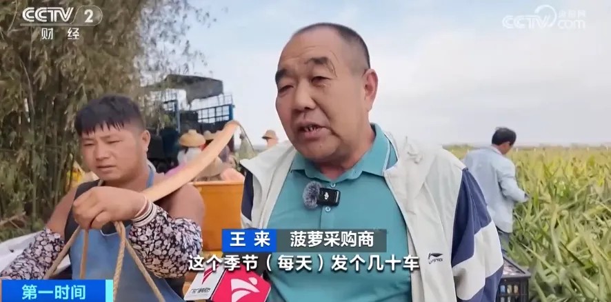 菠萝采购商 王来:我是从河南过来的,这个季节每天发几十车是没问题的,也就是几十万斤,基本上每天都发。