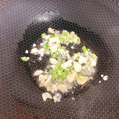4、热锅凉油,放入葱白和蒜片,小火煸炒出香味