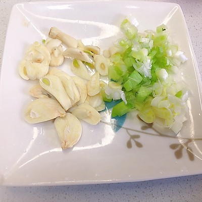 3、葱切葱花,蒜切片