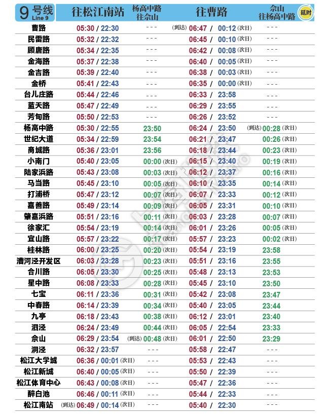 申通地铁集团说,因3/4号线明起启用新列车运行图,上海地铁各条线路首末班车时刻表也将调整。每周五、周六轨交9号线(部分区段)延长运营时间,如遇节假日另行安排。最新的首末班车时刻表详见↓