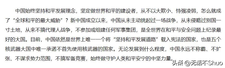 美国在世界各地引起战争,不断地恃强凌弱,打压其他国家,明明他们才是对世界和平威胁最大的国家,现在又反咬一口,真是“从未见过如此厚颜无耻之人”,中国自新中国成立后一直都是世界和平的建立者拥护者,从未入侵过别国,而美国呢?