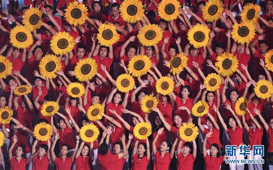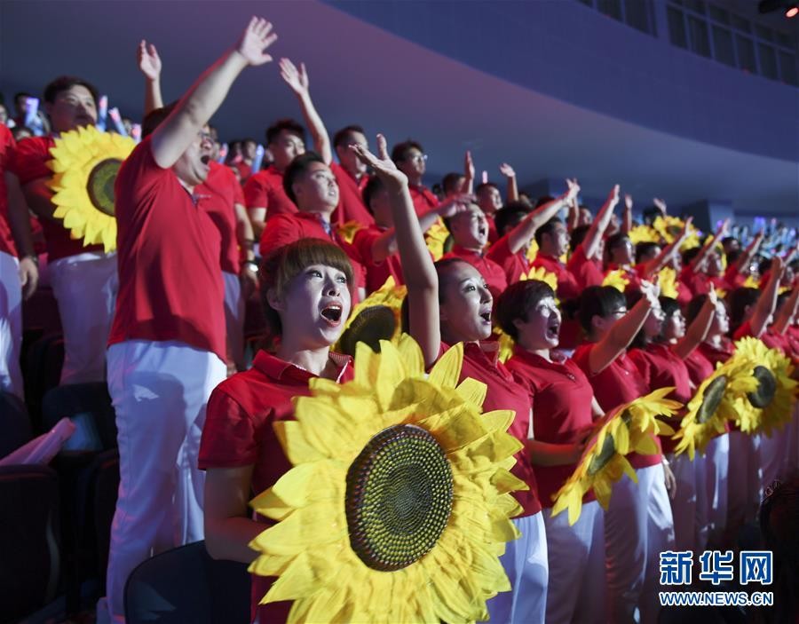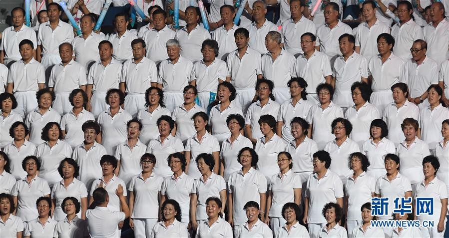 9月8日,演员们在闭幕式前进行暖场合唱表演。当日,第十三届全运会闭幕式在天津举行。新华社记者李贺摄