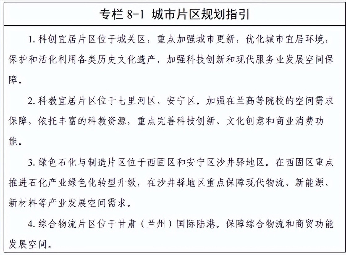 兰州生态创新城重点培育区域性科技创新功能和先进制造业,促进产学研一体化融合。鼓励通航产业发展,发展绿色生态、科技创新、大健康和数据信息等产业。优化其他县(区)产业空间布局。保障传统能矿产业转型升级的用地需求;鼓励皋兰县、永登县、榆中县特色农产品产业发展,重点加大对于特色农产品生产、仓储、物流的用地保障。