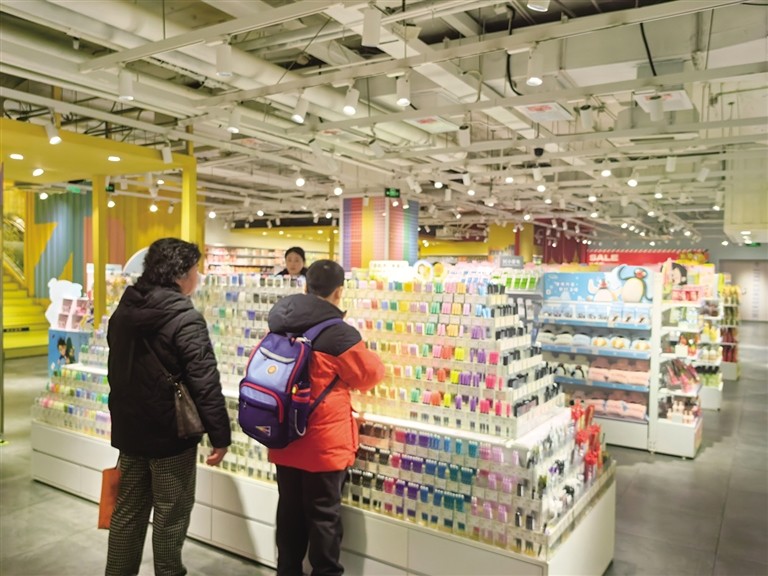 在国芳百货G层,文具文创杂物集合店里,笔、本、书包、修改带、便签本等文具散发着“磁力”,将路过的孩子家长“吸”进店内。“来之前我就和孩子列好了购物清单,相当于一站式购物了。”正在陪孩子选购的齐女士表示,尽管线下价格相对偏高,但进门看到这些高颜值、有创意的各色文具,被整齐摆放在敞亮的货架上,很容易激发起购买欲,“别说孩子了,我都跟着买了好几支笔和一个笔记本”。店里还有不少结伴前来购买文具的学生,每个人手上提着的小小购物篮很快就被中性笔、标签贴纸、书皮等填满。“和好朋友约好开学前一起来买文具,已经成为我们新学期开学前的最有仪式感的事了。”上高二的马同学告诉记者,平时做作业、记笔记,对笔的消耗量也很大,店里能试笔的出水量、笔触等书写细节,买到心仪的文具还能享受和朋友相聚的快乐。