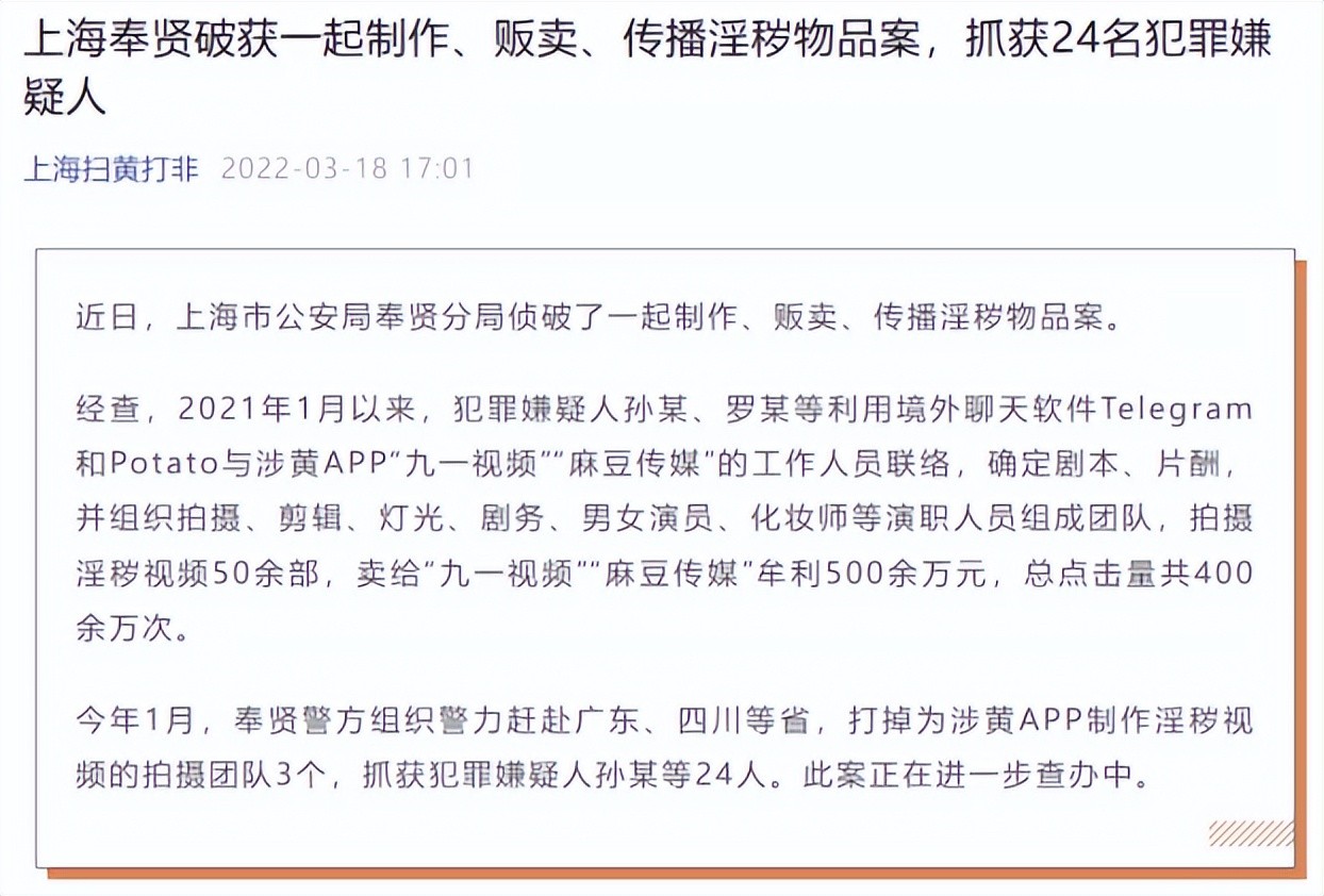 今年1月,奉贤警方组织警力赶赴广东、四川等省,打掉为涉黄app制作淫秽视频的拍摄团队3个,抓获犯罪嫌疑人孙某等24人。此案正在进一步查办中。
