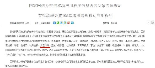 2020年12月,国家网信办清理处置105款违法违规移动应用程序,首批清理下架的APP中就包括麻豆传媒。