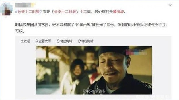 2019年,黄海波也出演了网剧《长安十二时辰》,虽然只是一个小配角,但是在播出的时候还是被AI换脸。
