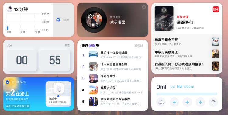 在这一选项中,我们可以将部分手机 App 的小组件放置到桌面中,比如菜鸟小组件可以看到目前快递情况、飞猪等 App 可以看到下一次的行程安排、喝水计量组件可以看到今日的饮水量等等。