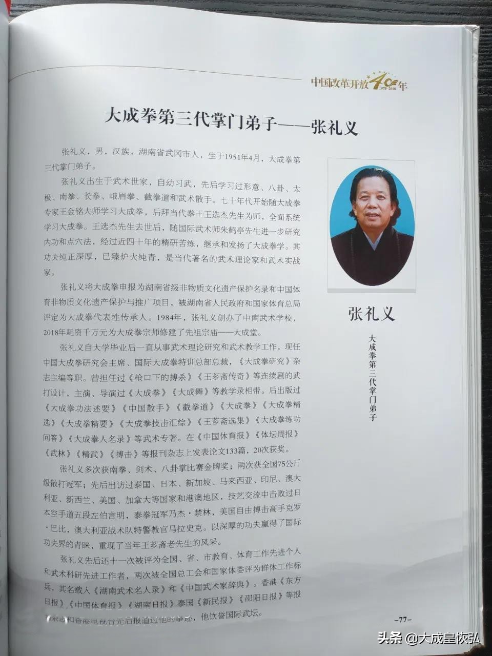 中国大成拳第三代掌门弟子张礼义自大学毕业后一直从事武术理论研究和武术教学工作,现任中国大成拳研究会主席、国际大成拳特训总部总裁,《大成拳研究》杂志主编等职。曾担任过《枪口下的搏杀》《王芗斋传奇》等连续剧的武打设计,主演、导演过《大成拳》《大成舞》等教学录相带。后出版过《大成拳功法述要》《中国散手》《截拳道》《大成拳》《大成拳精选》《大成拳精要》《大成拳技击汇综》《王芗斋选集》《大成拳练功问答》《大成拳人名录》等武术专著。在《中国体育报》《体坛周报》《武林》《精武》《搏击》等报刊杂志上发表论文133篇,20次获奖。