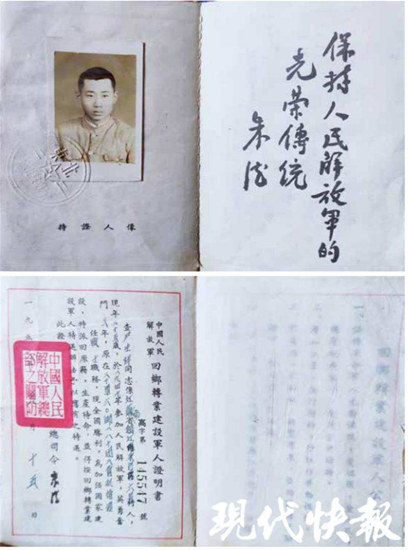 在尹生祥的卧室中,他参军时的照片挂了一整面墙,每每来人,他都要向客人介绍一番这段难忘的经历。虽然已经时隔 70 多年,但当时的情景依然历历在目。老人的床边放着军旅包,那段见证着这段历史的证件就收纳在包内。记者看到,1952 年尹生祥离朝回国时的《回乡转业军人登记表》《中国人民解放军回乡转业军人证明书》依然保存完好,上面盖的 " 东北转业建设委员会 " 的钢印章依然清晰可见,内有朱德总司令签发的 "…… 现全国胜利,为加强 国家建设,特派回原籍,生产待命,并得按回乡转业建设军人待遇办法予以应有之待遇。此证。" 另加盖 " 中国人民解放军总部之关防 " 大印。而在床边的柜子里,他珍视的中国人民志愿军抗美援朝出国作战 70 周年纪念章以及光荣在党 50 年徽章则用锁锁了起来。