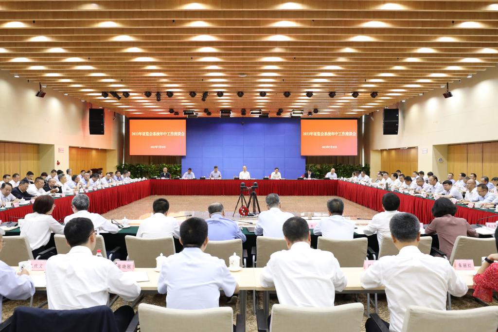 据证监会官网,7 月 24 日至 25 日,中国证监会召开 2023 年系统年中工作座谈会。会议以习近平新时代中国特色社会主义思想为指导,认真学习贯彻中央政治局会议精神,落实党中央、国务院决策部署,总结工作,分析形势,研究部署下半年重点工作。证监会党委书记、主席易会满作题为《坚定信心稳中求进奋力推进中国特色现代资本市场建设》的工作报告。证监会党委委员、副主席李超主持会议。中央主题教育第三十三指导组副组长卢希,证监会党委委员、副主席方星海,党委委员、中央纪委国家监委驻证监会纪检监察组组长樊大志,党委委员、副主席王建军出席会议。