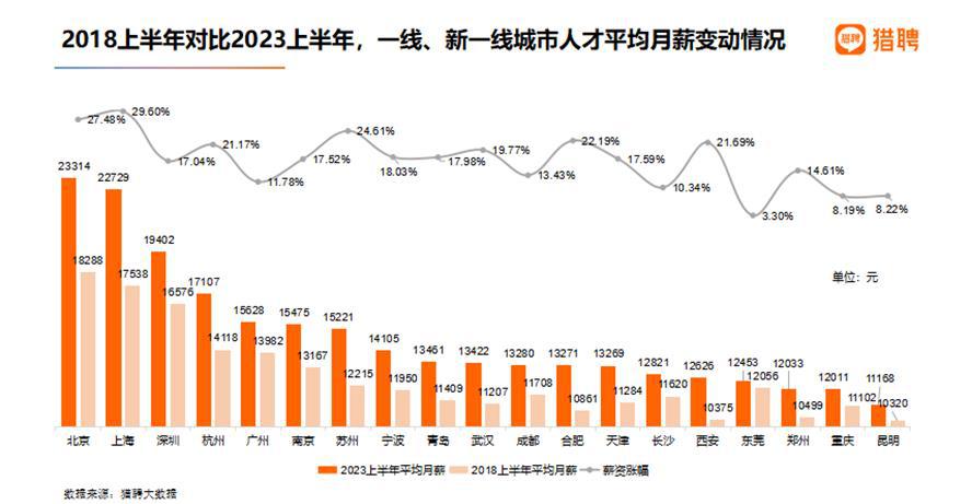 中新经纬 7 月 25 日电 日前,同道猎聘旗下猎聘发布《2023 上半年人才流动与薪酬趋势报告》,报告显示,从 2023 年上半年趋势来看,越来越多的年轻人正涌向新一线城市。2023 年人才投递热门城市前三分别为上海、北京和深圳。薪资方面,北京平均月薪 18976 元全国最高,而上海近六年来薪资涨幅最高,达 29.6%。