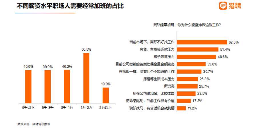 当被问及能够坚持这份经常需要加班的工作的原因,得票率最高的为当前市场情况下,离职不好找工作;房贷、车贷等还款压力以 51.4% 的得票率位居第二;孩子养育压力得票率为 48.6%,位居第三。