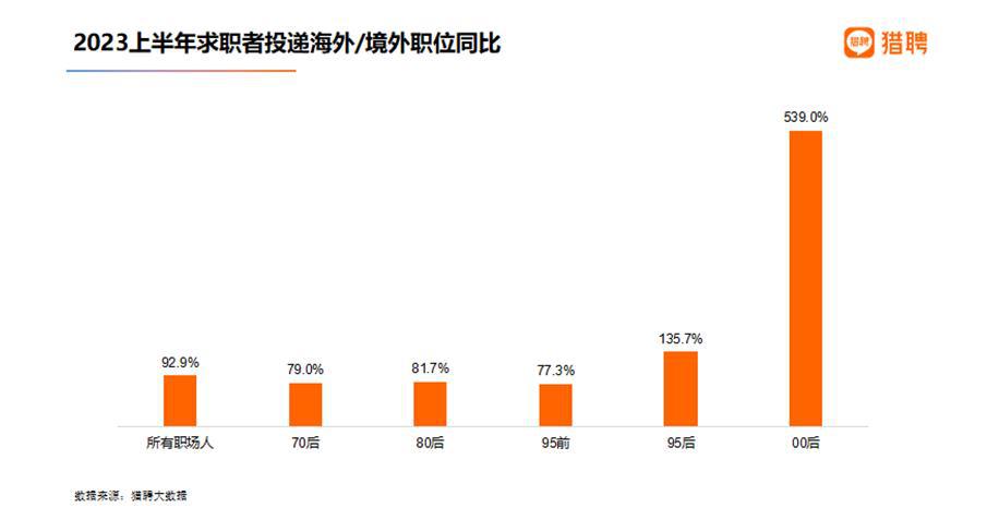 在人才出海、出境就业方面,猎聘发布的报告称,随着去年底疫情管控措施的放开,人才跨区域、跨境恢复往日的便利。2023 上半年求职者投递海外 / 境外职位同比去年同期增长 92.9%。